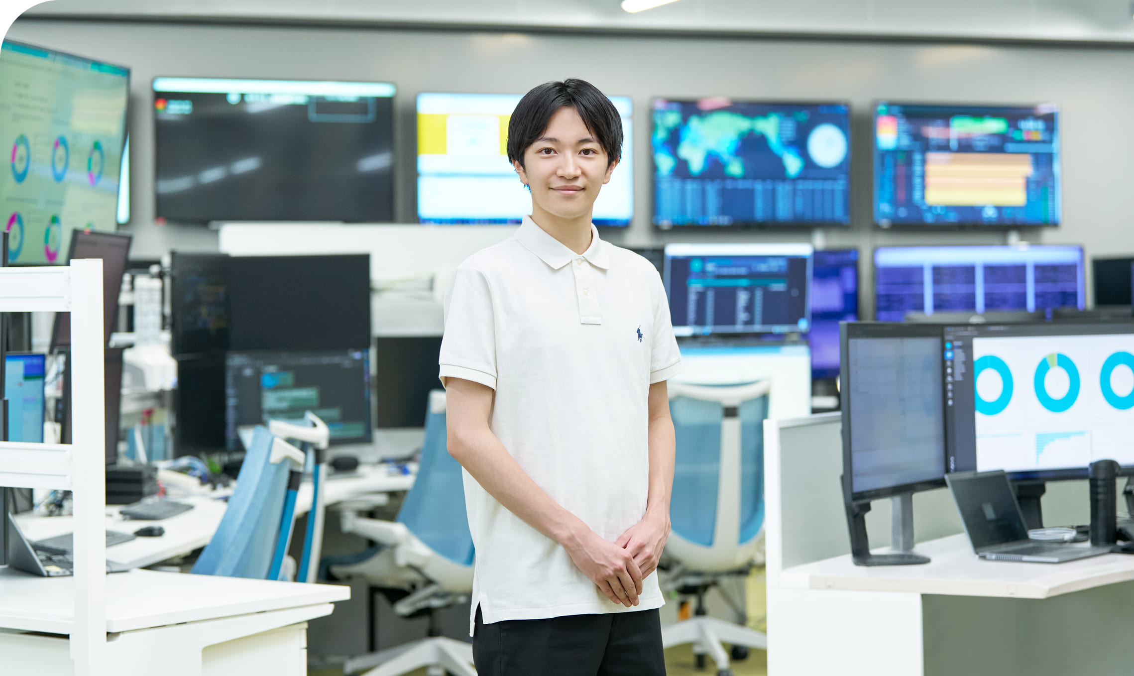 現在は、社内のゼロトラスト・セキュリティ監視や、お客さま向けセキュリティサービスの運用を担当しています。端末、UTM、クラウドなど幅広い領域を扱うため、特定の分野に深く特化するより、広い知識を持ち、臨機応変に対応する力が求められます。毎日大量のアラートを確認し、異常があれば迅速に分析・対応するのが役割です。印象に残っているのは、通常と異なるアラートに気づき、今まで培った経験をベースに迅速に対応してインシデントを未然に防いだときのこと。上司から「よく気づけた」と声をかけてもらい、自分の行動や判断が世の中に役に立っていると実感しました。日々の業務は地道ですが、社員やお客さまの安心を提供できていることは、仕事のモチベーションにつながっています。今では後輩にも経験を伝えながら、チーム全体で成長できる環境づくりを意識しています。