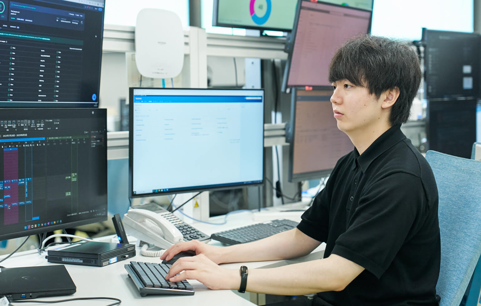システムを守る最前線に。現在はセキュリティ監視業務を担当しています。膨大なログや通信データを常時監視し、不審な兆候があれば速やかに調査・対応するのが役割です。攻撃は自動化・巧妙化が進んでおり、判断の遅れが大きな被害につながるため、一瞬の油断も許されません。日々の業務は緊張感がありますが、それだけ社会的意義を実感できる仕事だと感じています。入社当初は脆弱性診断業務にも携わりました。その際に先輩から「システムの気持ちになって考えること」の大切さを教わったことが、今も仕事の軸になっています。単に脆弱性を探すのではなく、攻撃者はどんな情報を狙うのか、システムがどう応答するのかを想像することで、診断の深度が変わるという学びでした。この視点は監視業務でも活かされ、アラートを処理するだけでなく、その裏にある意図や脅威を読み取る姿勢につながっています。